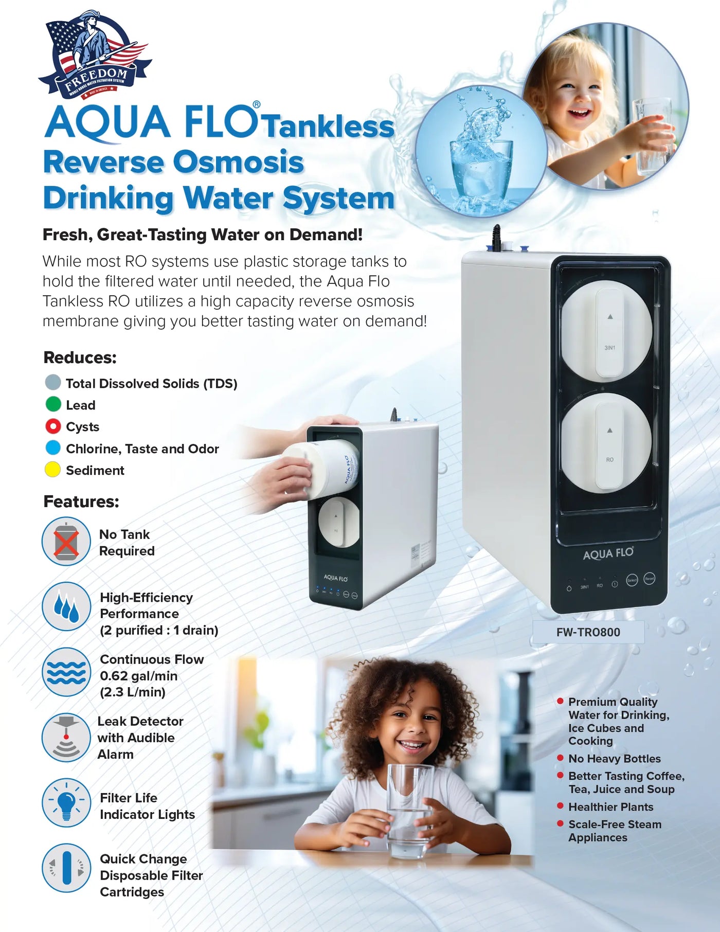 The Aqua Flo Tankless Reverse Osmosis System delivers fresh, great-tasting water on demand through an advanced, space-saving design. With no storage tank required, it provides continuous flow, intelligent filter monitoring, and whisper-quiet performance—all in one compact unit.