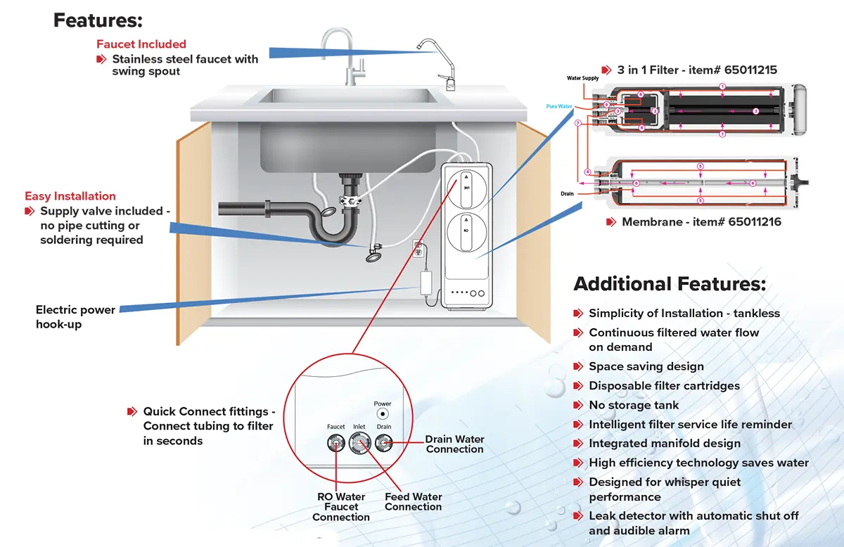 - High-efficiency 2:1 purified-to-drain ratio saves water