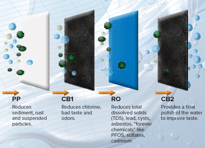 The core purification stage that removes total dissolved solids (TDS), lead, cysts, asbestos, PFOS, sulfates, cadmium, and other contaminants.